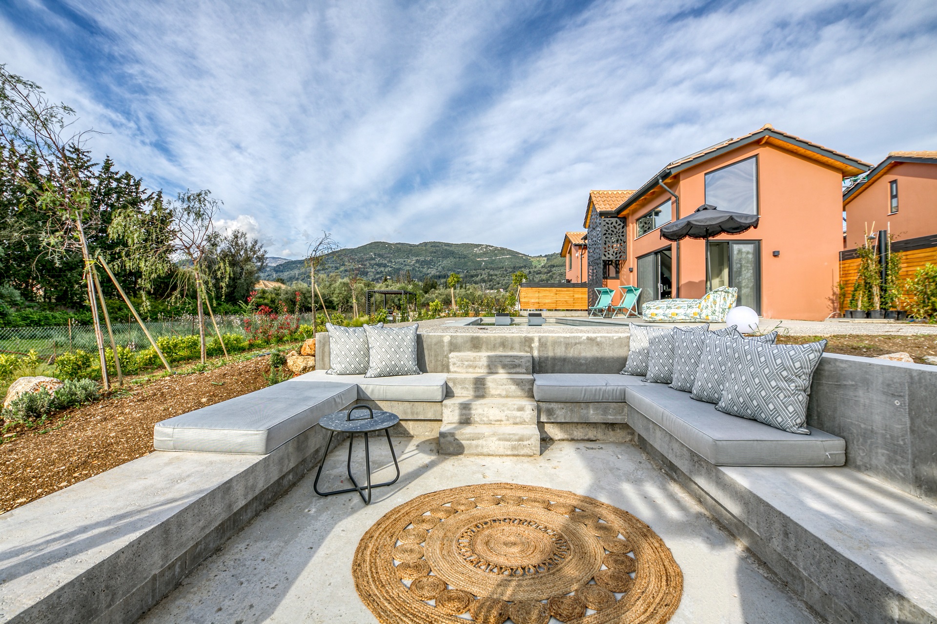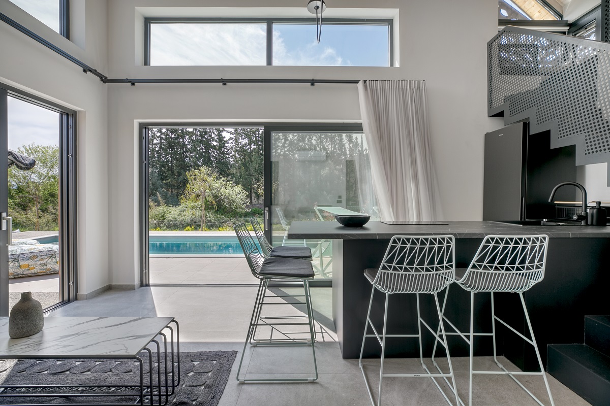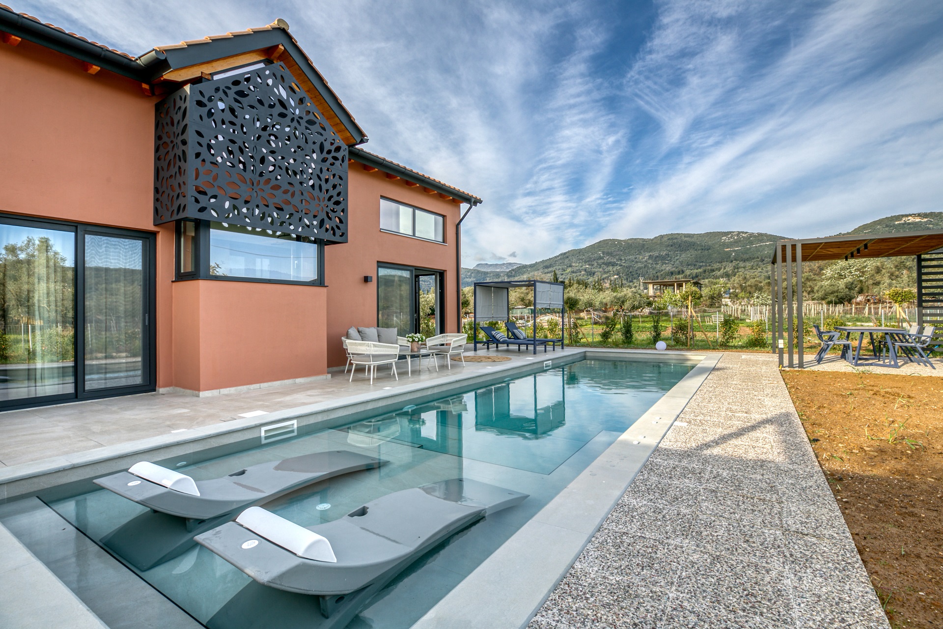 Με ένα εντυπωσιακό εξωτερικό χρώμα από τερακότα, είναι κομψό και φιλόξενο κρυμμένο σε έναν ιδιωτικό αποκλειστικό κλειστό θύλακα 4 βίλες, κοντά στα χωριά Λυγιά και Καρυώτες. Με μια καλή πισίνα και βεράντα, είναι μια απόλαυση να χαλαρώσετε γύρω από την πισίνα που περιβάλλεται από χωράφια και ελαιώνες. Το εσωτερικό έχει τον κύριο χώρο καθιστικού, τραπεζαρίας και κουζίνας με ψηλές οροφές με κομψό μοντέρνο ντιζάιν στο ισόγειο, με υπνοδωμάτιο με διπλό κρεβάτι και μπάνιο με ντους και μπαλκονόπορτες που ανοίγουν σε βεράντα. Στον ημιώροφο πάνω, προσβάσιμο από μια σκάλα, βρίσκεται ένα επιπλέον υπνοδωμάτιο με διπλό κρεβάτι με ενιαίο μπάνιο με ντους.